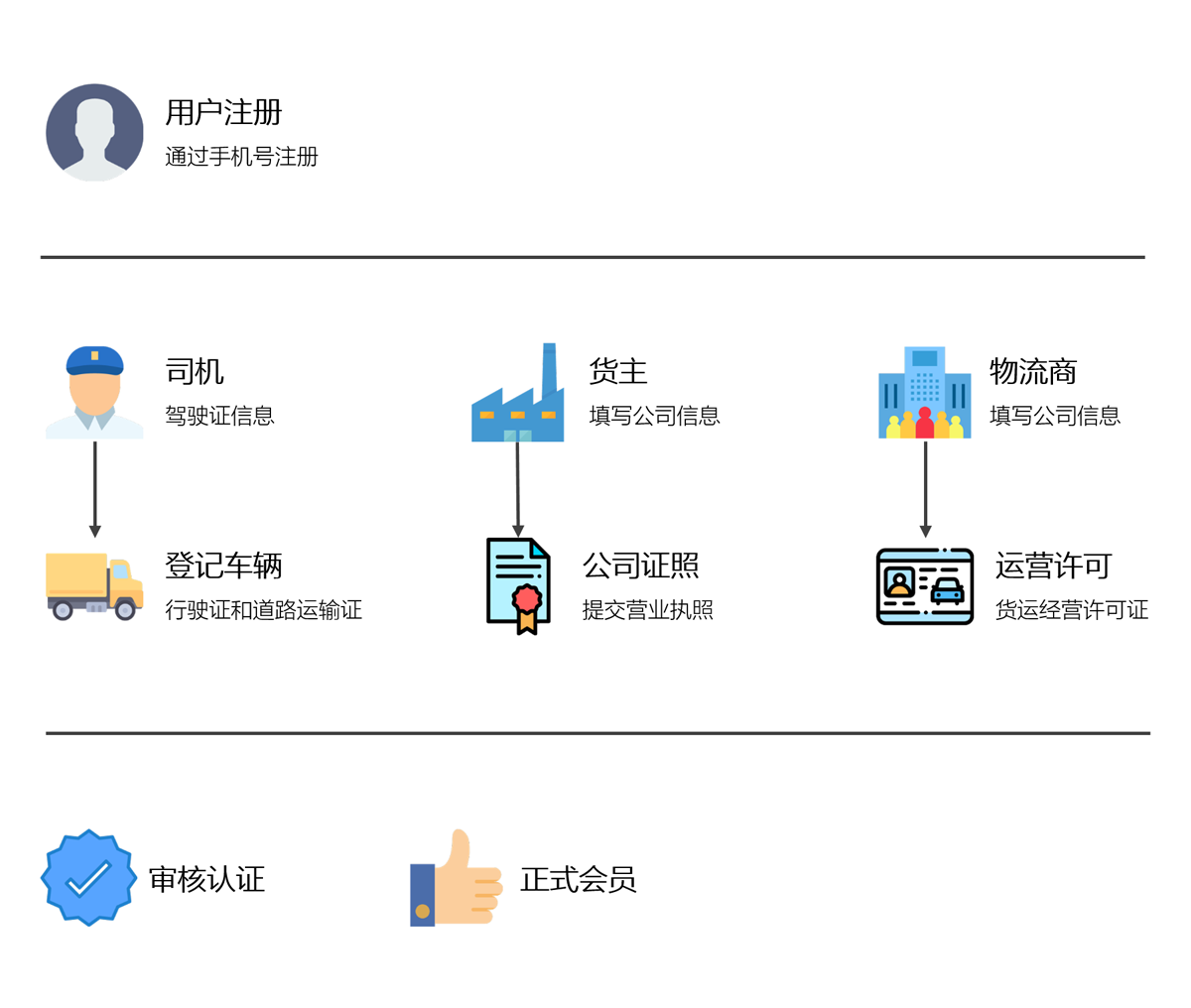 平台采用实名认证,用户通过手机号注册,选择其业务身份——司机、货主、物流商的其中一种身份: